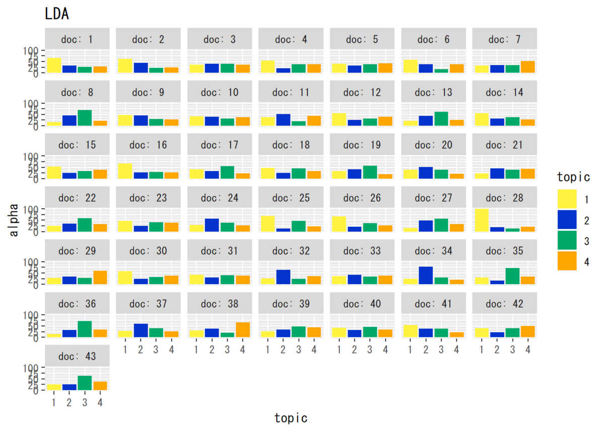 ## トピック分布のパラメータ # データフレームを作成 alpha_df_wide <- cbind(as.data.frame(alpha_dk), as.factor(1:D)) # データフレームをlong型に変換 colnames(alpha_df_wide) <- c(1:K, "doc") # key用に行名を付与 alpha_df_long <- gather(alpha_df_wide, key = "topic", value = "alpha", -doc) # 変換 alpha_df_long$topic <- alpha_df_long$topic %>% # 文字列から因子に変換 as.numeric() %>% as.factor() # 作図 ggplot(data = alpha_df_long, mapping = aes(x = topic, y = alpha, fill = topic)) + # データ geom_bar(stat = "identity", position = "dodge") + # 棒グラフ facet_wrap(~ doc, labeller = label_both) + # グラフの分割 labs(title = "LDA") # タイトル