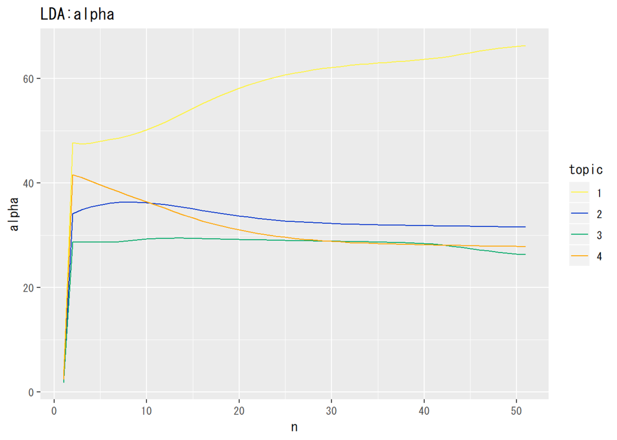 ## トピック分布のパラメータ # データフレームを作成 trace_alpha_df_wide <- cbind(as.data.frame(trace_alpha), 1:nrow(trace_alpha)) # 試行回数 # データフレームをlong型に変換 colnames(trace_alpha_df_wide) <- c(1:K, "n") # key用の行名を付与 trace_alpha_df_long <- gather(trace_alpha_df_wide, key = "topic", value = "alpha", -n) # 変換 # 描画 ggplot(data = trace_alpha_df_long, mapping = aes(x = n, y = alpha, color = topic)) + # データ geom_line() + # 棒グラフ labs(title = "LDA:alpha") # タイトル
