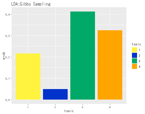 ## トピック分布(平均値)の確認 # データフレームを作成 theta_df <- data.frame(topic = as.factor(1:K), prob = alpha_k / sum(alpha_k)) # 描画 ggplot(data = theta_df, mapping = aes(x = topic, y = prob, fill = topic)) + # データ geom_bar(stat = "identity", position = "dodge") + # 折れ線グラフ labs(title = "LDA:Gibbs Sampling") # タイトル