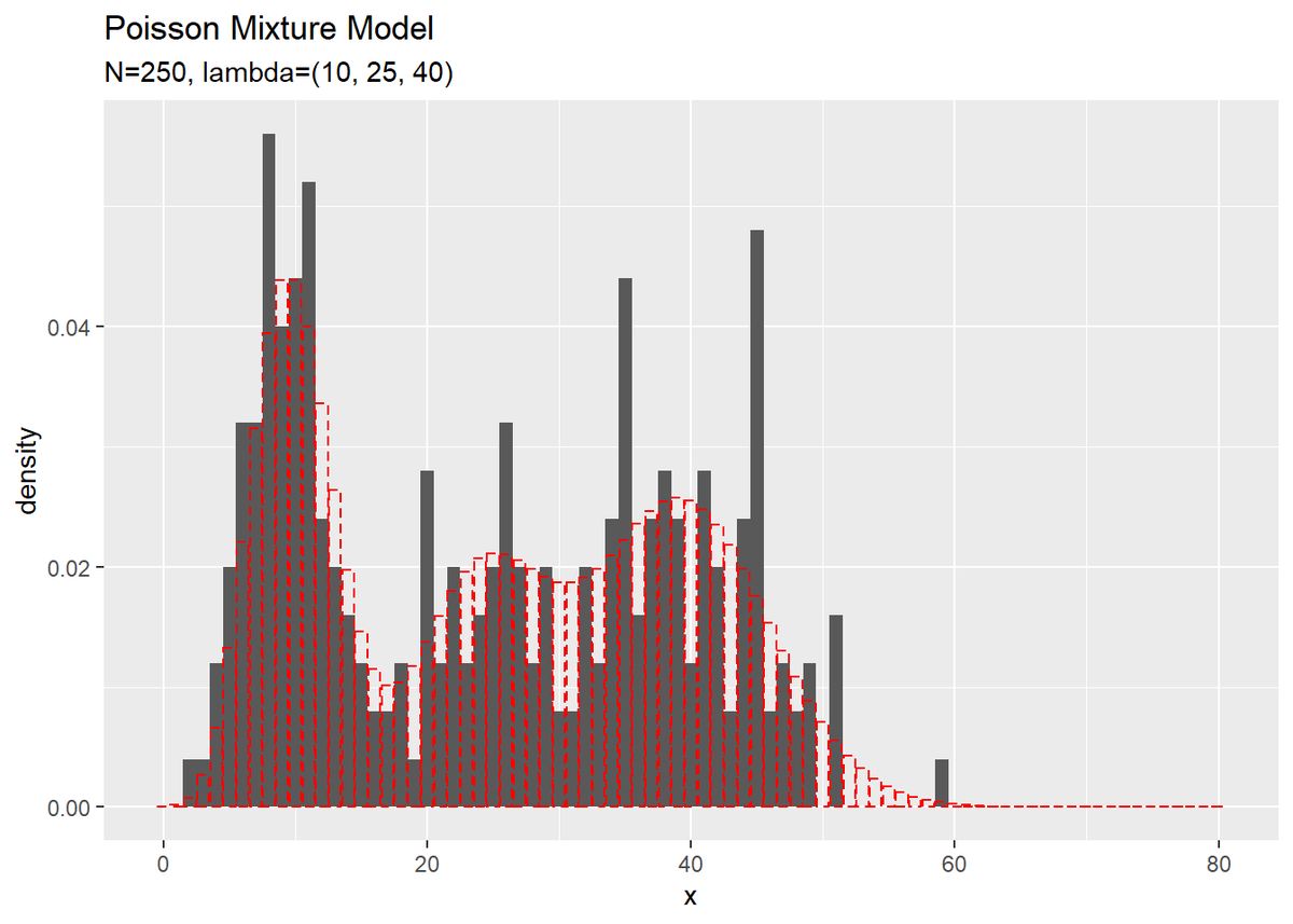 # 観測データのヒストグラムを作成 ggplot() + geom_histogram(data = x_df, aes(x = x_n, y = ..density..), binwidth = 1) + # 観測データ geom_bar(data = model_df, aes(x = x, y = prob), stat = "identity", position = "dodge", alpha = 0, color = "red", linetype = "dashed") + # 真の分布 labs(title = "Poisson Mixture Model", subtitle = paste0("N=", N, ", lambda=(", paste0(lambda_truth_k, collapse = ", "), ")"), x = "x")