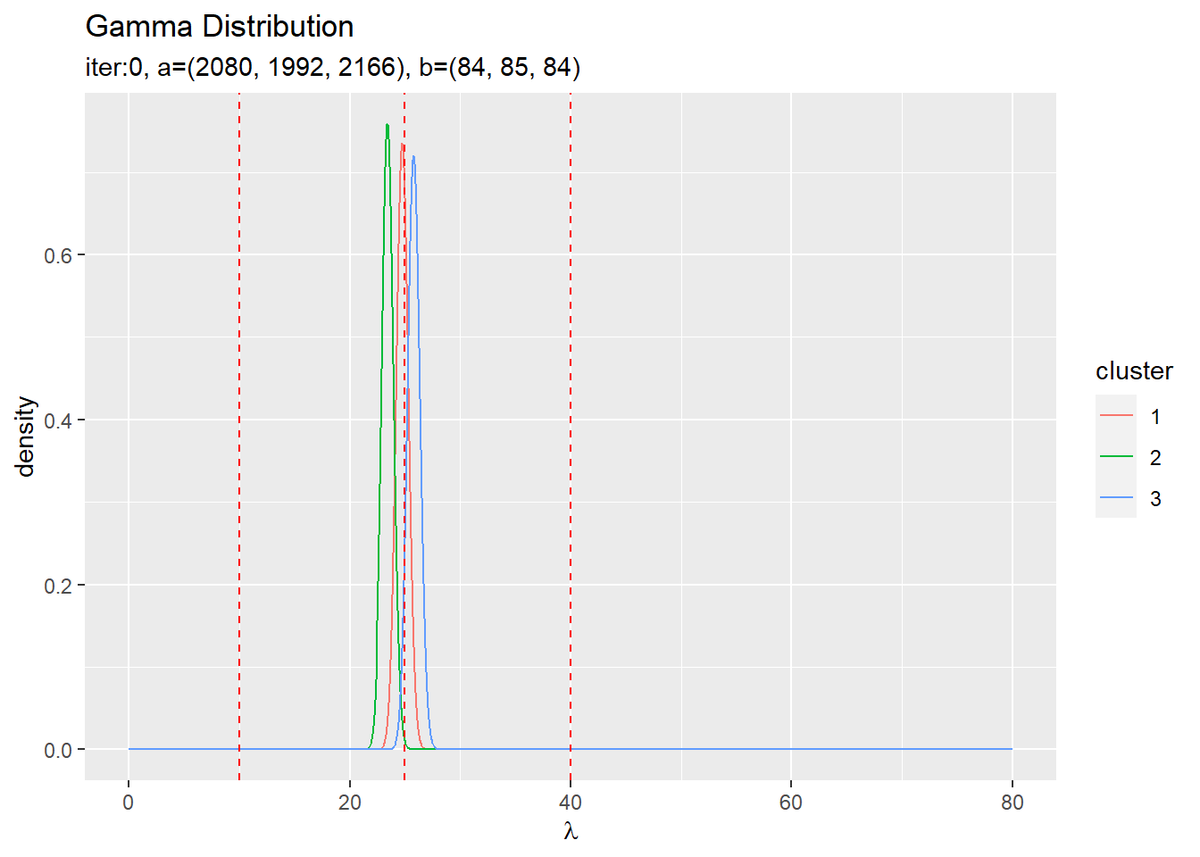 # 作図用のデータフレームを作成 trace_posterior_lambda_df <- tibble() for(i in 1:(MaxIter + 1)) { for(k in 1:K) { # クラスタkの事後分布を計算 tmp_posterior_df <- tibble( lambda = lambda_vec, density = dgamma(x = lambda, shape = trace_a_ik[i, k], rate = trace_b_ik[i, k]), cluster = as.factor(k), label = paste0( "iter:", i - 1, ", N=", N, ", a=(", paste0(round(trace_a_ik[i, ], 1), collapse = ", "), ")", ", b=(", paste0(round(trace_b_ik[i, ], 1), collapse = ", "), ")" ) %>% as.factor() ) # 結果を結合 trace_posterior_lambda_df <- rbind(trace_posterior_lambda_df, tmp_posterior_df) } # 動作確認 #print(paste0((i - 1), ' (', round((i - 1) / MaxIter * 100, 1), '%)')) }