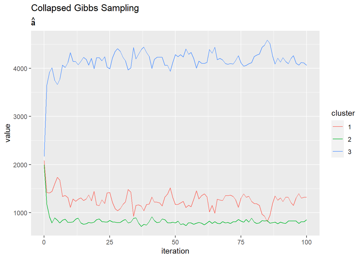 # aの推移をデータフレームに格納 trace_a_df <- dplyr::as_tibble(trace_a_ik) %>% # データフレームに変換 cbind(iteration = 0:MaxIter) %>% # 試行回数の列を追加 tidyr::pivot_longer( cols = -iteration, # 変換しない列 names_to = "cluster", # 現列名を格納する列名 names_prefix = "V", # 現列名の頭から取り除く文字列 names_ptypes = list(cluster = factor()), # 現列名を値とする際の型 values_to = "value" # 現セルを格納する列名 ) # 縦持ちに変換 # aの推移を作図 ggplot(trace_a_df, aes(x = iteration, y = value, color = cluster)) + geom_line() + labs(title = "Collapsed Gibbs Sampling", subtitle = expression(hat(bold(a))))